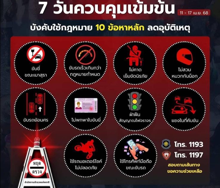 ตำรวจบังคับใช้กฎหมาย 10 ข้อหาหลัก เพื่อลดความเสี่ยงปัจจัยของอุบัติเหตุที่ทำให้เกิดการสูญเสียในช่วงเทศกาลสงกรานต์ 2568 .
