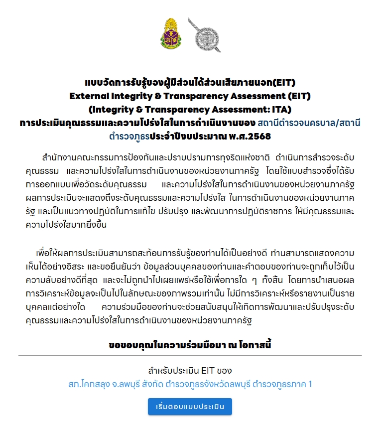 สถานีตำรวจภูธรโคกสลุง ได้ดำเนินการประชุมการขับเคลื่อนการประเมินคุณธรรมและ  ความโปร่งใสในการดำเนินงานของหน่วยงานภาครัฐ (Integrity and Transparency Assessment: ITA)    ของสถานีตำรวจ ประจำปีงบประมาณ พ.ศ. 2568 โดยมี พันตำรวจโทชาญ คำยวน สารวัตรสถานีตำรวจภูธรโคกสลุง เป็นประธานการประชุม ซึ่งการประชุมดังกล่าวมีวัตถุประสงค์เพื่อแจ้งคำสั่งแต่งตั้งคณะกรรมการขับเคลื่อนการประเมินคุณธรรมและความโปร่งใสในการดำเนินงานของหน่วยงานภาครัฐ (Integrity and Transparency Assessment: ITA) ของสถานีตำรวจ และทำความเข้าใจ  กรอบการประเมินคุณธรรมและความโปร่งใสในการดำเนินงานของหน่วยงานภาครัฐ (Integrity and Transparency Assessment: ITA) ของสถานีตำรวจ ประจำปีงบประมาณ พ.ศ. 2568 ประกอบด้วย 3 ประเด็นสำคัญ ได้แก่